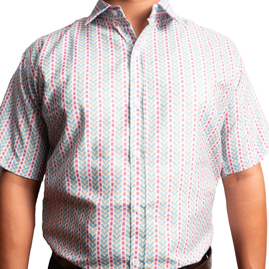 Refresh your wardrobe with this Men's Light Green Arrow Pattern Half Sleeve Shirt. Featuring a distinctive arrow pattern, this men's half shirt is both trendy and comfortable. A great printed shirt for men who appreciate style.